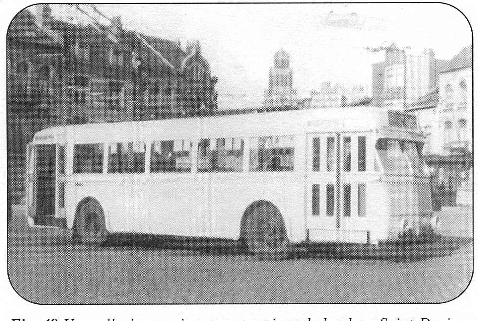 Un trolleybus de la deuxième série stationne à son terminus place Saint-Denis. Ces véhicules furent mis en service peu de temps après les premiers. Quelques différences apparaissent déjà par rapport aux premiers.