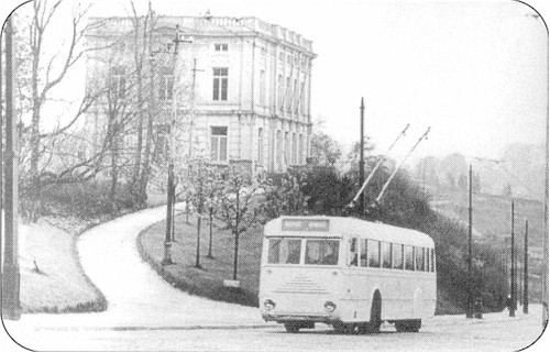 In het begin van het dienst reed de trolleybus 6012 aan de top van de Victor Rousseaulaan, naast het Dudenpark, ongeveer 1939.