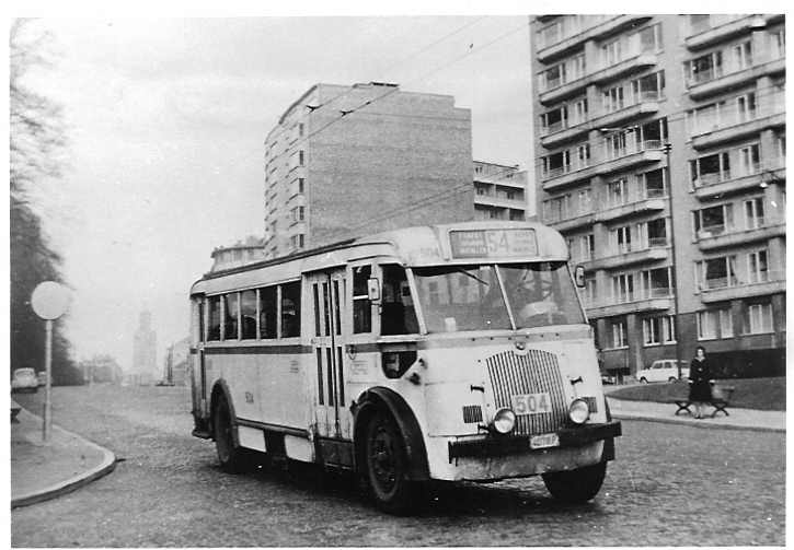 Een Brossel AB6DS op lijn 54, Victor Rousseaulaan, aan het kruispunt met Domeinlaan. Deze bussen reden op deze lijn om defekte trolleybussen te vervangen. Bus 504 bestaat nog vandaag, in de collectie van het MSVB